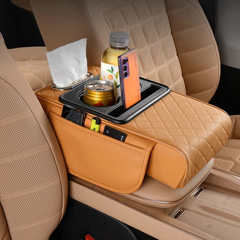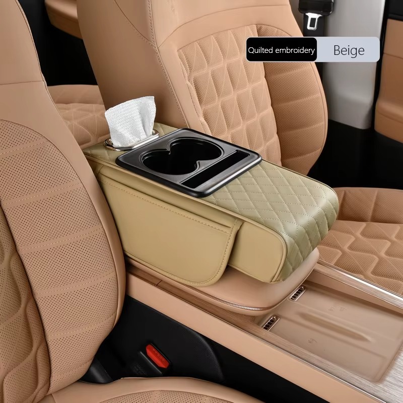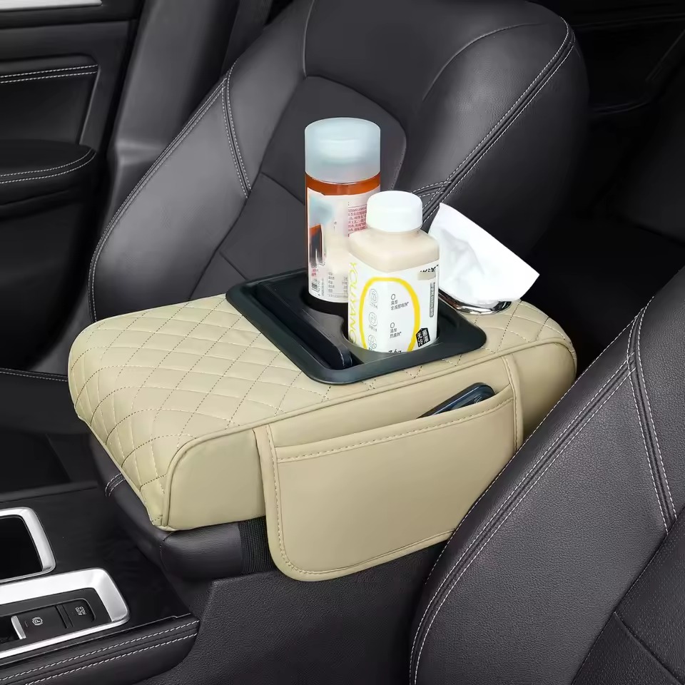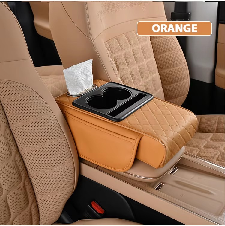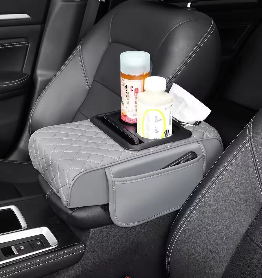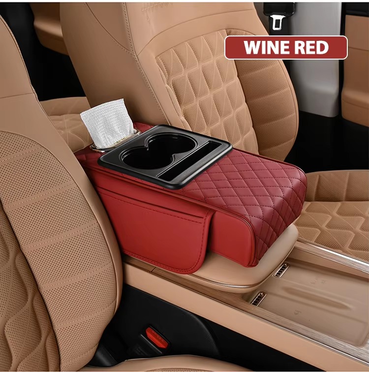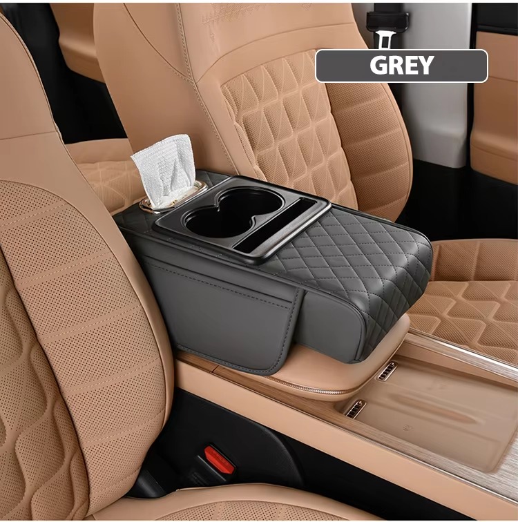Upgrade your ride with our New Design Auto Center Console Armrest Cushion. 3-in-1 multipurpose pad with dual cup holders, tissue holder, and side storage. Universal fit, high quality, and ultra-convenient. Colors: Black and White