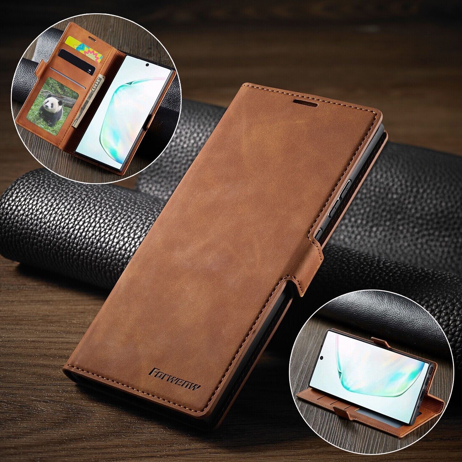 Practical Card Holder:Â Â The Galaxy Note 10 Plus leather case with convenient magnetic snap keeps all your valuables in place neatly and securely, has 2 card holder slots, 1 money pocket and 1 transparent window for easy access to your photo. Perfect for a more active and convenient life